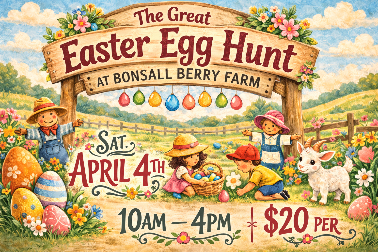 Celebrate Easter with a beautiful day on the farm at Bonsall Berry Farm. Bring the whole family and enjoy fresh air, rolling hills, and a day full of springtime fun. Our Great Easter Egg Hunt is the perfect way to spend time outside together, make memories, and experience the simple magic of the farm.